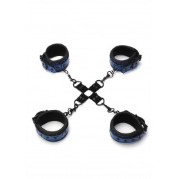Two sets of cuffs one for the wrists the other for the thighs. Lets you restrain your partner in many positions. Adjust to fit almost any size and connect and disconnect quickly and discreet.