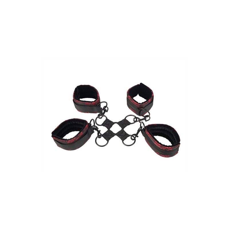 Turn any size bed into a place of binding pleasure. Restraint straps your partners arms or legs from the sides or the top and bottom of the bed. Portable and travel-sized. Includes 4 cuffs and restraint straps. Cuffs adjust from 4 - 12 inches.