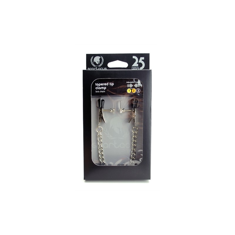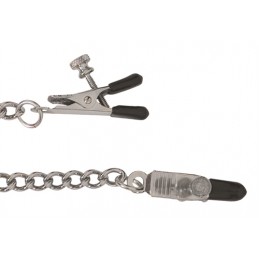 Clamp Union. This two in one set is made with submission in mind. The attached to a front D-ring. Ending the chains are adjustable nipple clamps that are quickly and easily made tighter or more loose with thumb screws so you can decide just how much