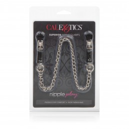Clamp Union. This two in one set is made with submission in mind. The attached to a front D-ring. Ending the chains are adjustable nipple clamps that are quickly and easily made tighter or more loose with thumb screws so you can decide just how much