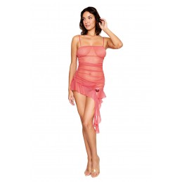 Black stretch mesh skirted thong with adjustable garters and pink satin bows. Boxed