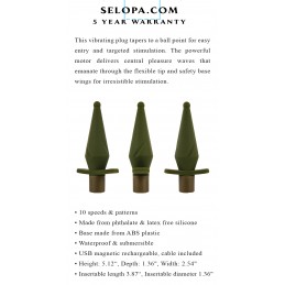 Dual motor silicone probe. USB Rechargeable. Intensely powerful dual motors. 5 functions of vibration pulsation and escalation plus independent incremental speed controls. Rechargeable Lithium Ion battery. Complete charge in 2.5 hours Unscented no