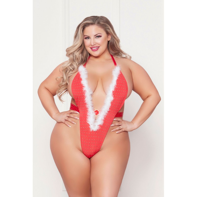 Sexy deep front and side panel fishnet inspired design. Stretch nylon bodysuit with thong back. One size fits most. Boxed packaging.
