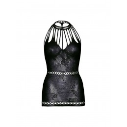 Three piece set. Adjustable elastic halter with gold chains, elastic garter belt with gold chains and removable garter straps, matching mesh and elastic g-string panty with gold hardware. • Material: 90% nylon, 10% elastane • One size fits most dre