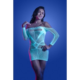 Fishnet garter dress with lace hem and attached matching thigh high stockings. Thong not included. Boxed