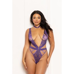 Stretch faux-leather halter teddy set • Collar with silver studs and ring details • Vecro back neck closure • Plunging neckline • Removable flogger accessory that can clip to collar ring • Open back with G-string and adjustable elastic waist