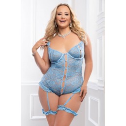 Strapless fishnet teddy with zipper back, shiny elastic belt, gold hardware, and removable leg garters. • Material: 90% nylon, 10% elastane • Queen size fits most dress size 14-20 • Boxed item