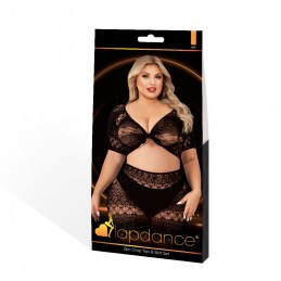 Net crop top with keyhole cut-out and high waisted panty. • Material: 90% nylon, 10% spandex • Queen size fits most US dress sizes 14-18 • Boxed item