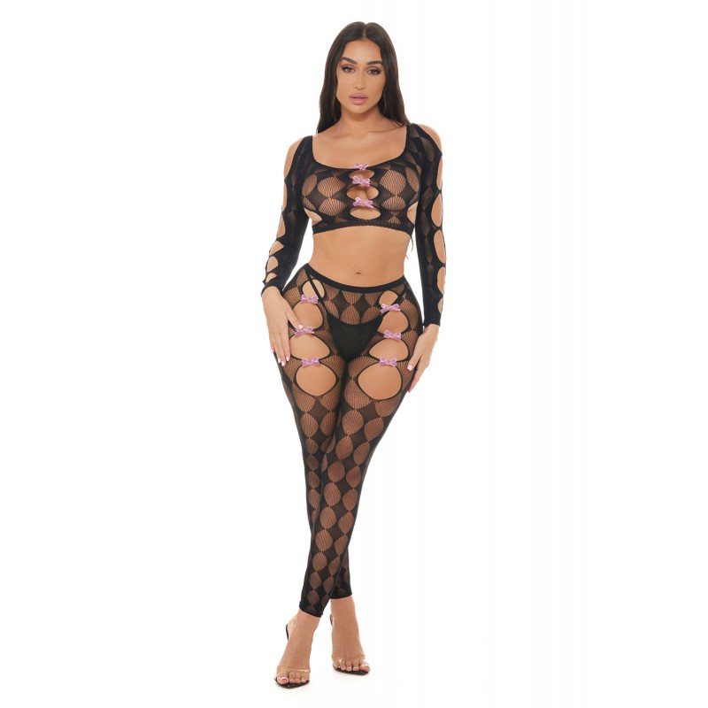 Fishnet thigh hi with a back seam and satin bow. Boxed Items