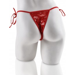 Lurex lace open crotch boyshort with front lace-up detail and removable garters. Poly bag item Display Bag