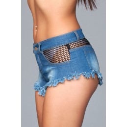 Medium wash denim shorts with distressed details on front and back pockets - button and zipper closure. Poly bag packaging.