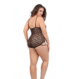 Black lace teddy with cage lace front and adjustable straps. Boxed packaging.