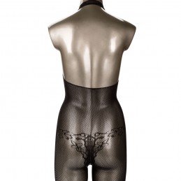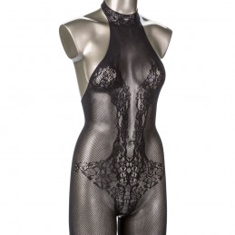 Fishnet and lace bodystocking with open crotch. 90% Nylon, 10% Spandex Boxed
