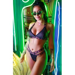 This style includes a halter traingle bra that ties around the neck and back and matching tie side micro thing. Shimmery jet black stretch lace. Boxed