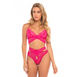 Four Piece lace Set includes Matching Top with racer back, thong, Eye Mask, and Lace Cuffs. Bra includes clip on the front. Style is available in black. Made in Colombia - South America with USA and Colombian fabrics. Boxed packaging.
