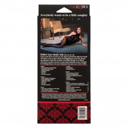 Stretch scalloped galloon lace teddy with plunging halter neckline, fluttery chiffon ruffles at hip, peek-a-boo back, open crotch, tie-neck closure and satin back-tie bow at waist. Boxed.