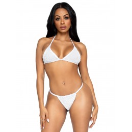 All over lace! You'll feel and look so feminine in this lacy two-piece set, which features beaded string sides beneath its halter neck and split back. Matching strings on the back of the panty are made out of the same sheer burgundy lace fabric an