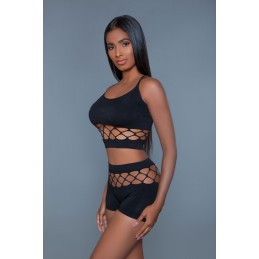 Sultry-sweet garter teddy is a mix of a dreamy lace bustier with a peek-a-boo criss cross romantically connected to its matching thong through a strappy cage torso, making it a one piece with unique sexy style. Includes lace garters. One size fit