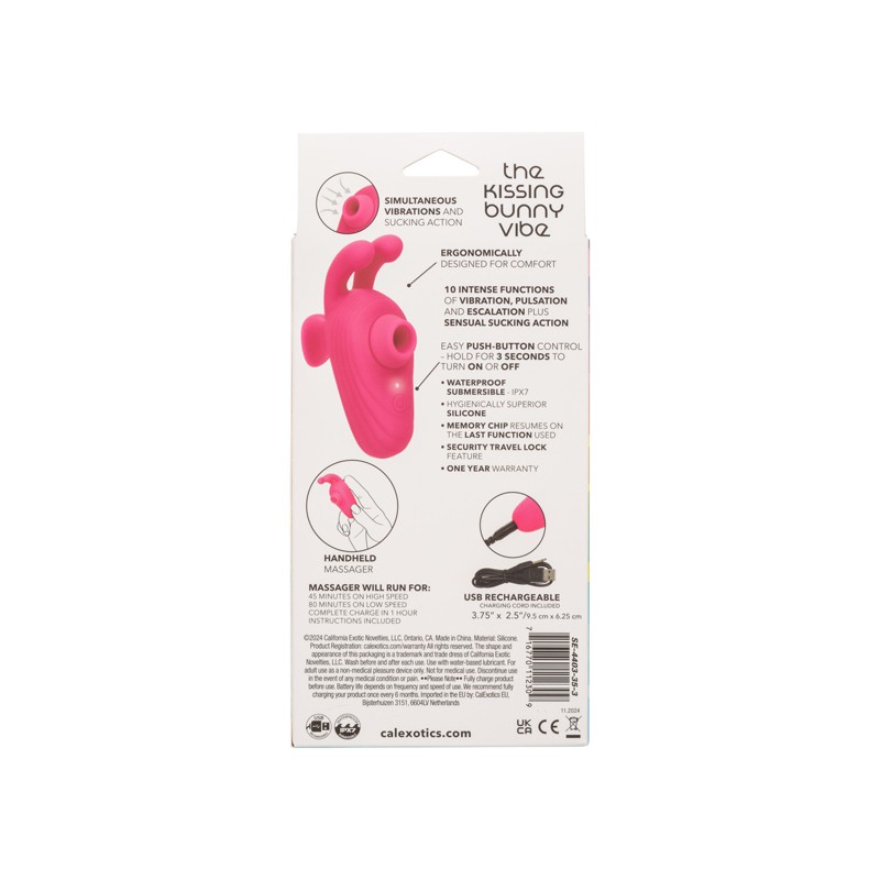 Enhance your pleasure with the 10 intense functions of vibration, pulsation, and escalation that the Kissing Bunny Vibe offers. Each setting invites you to explore different rhythms and depths of sensation, ensuring that your personal experience is both varied and thrilling. This massager is crafted from body- safe silicone and boasts a fully waterproof design with an IPX7 rating, allowing you to indulge in your desires wherever the mood strikes—be it during a bath or a refreshing shower.