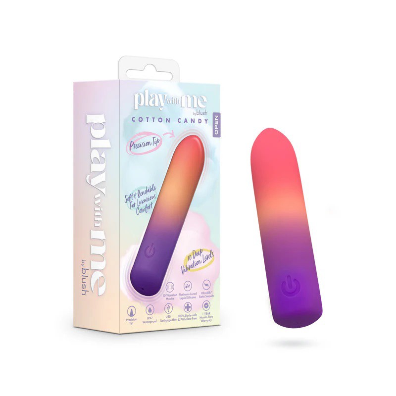 Satisfy your deepest desires with Play With Me’s Cotton Candy, a petite powerhouse that turns every touch into sweet indulgence. Designed for playful pleasure, this adorable, pocket-sized vibrator reveals 10 deep yet quiet vibration modes, with a precision tip for targeted sensations, guiding you to moments of pure bliss. Whether it’s slow, seductive foreplay, pinpoint clitoral stimulation, or sensual nipple pleasure, Cotton Candy delivers focused vibrations exactly where you crave them most. Explore a range of sensations, from gentle pulses to deep, resonant thrills, to discover your ultimate pleasure points. Crafted from Blush’s Purio platinum-cured liquid silicone, the vibrator’s lusciously soft and bendable design ensures sweet and customizable pleasure. Its IPX7 waterproof rating ensures adventurous play, and USB charging adds convenience. Embrace the irresistible sensations of Cotton Candy and let every touch delight your senses, transporting you to a world of sensual indulgence.