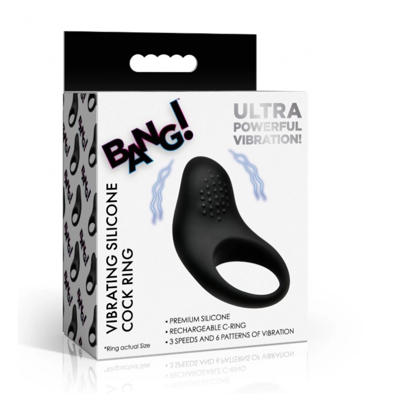 The Bang! Vibrating Silicone Cock Ring is a rechargeable couples vibrator built from premium body-safe silicone and ABS plastic. The soft clitoral stimulation pad sits flush against the body during penetration, delivering direct vibration to the cl