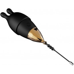 Two ultra-powerful independently controlled bullets with a removable bunny tease r. PVC (bunny), ABS with silver plating (bullet), and ABS (controller). Requires 3 AA batteries. Bullet measures 2.5" x 1".