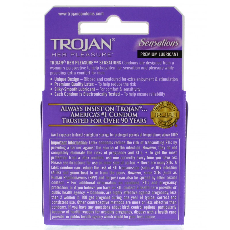 Trojan Her Pleasure condoms are designed from a woman's perspective to help heighten her sensation and pleasure while providing extra comfort for men. The unique design is ribbed and contoured for extra enjoyment and stimulation. T hese condoms are