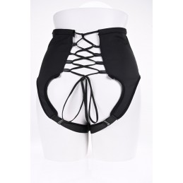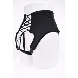 Black leather harness with a red Vac U Lock plug can be used by either sex. Includes a 8 inch ultra realistic cock and a powder lube dispenser.
