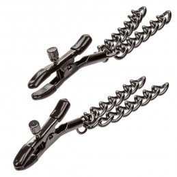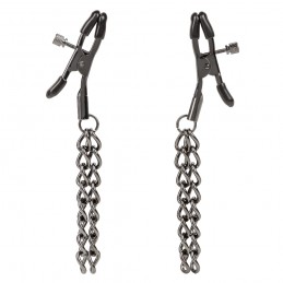 These tweezer style nipple clamps adorn the chest with three graduated silver balls that dangle from the end. The adjustable clamps have a sliding ring that will allow you to modify the amount of pressure that is applied and are coated with vinyl for