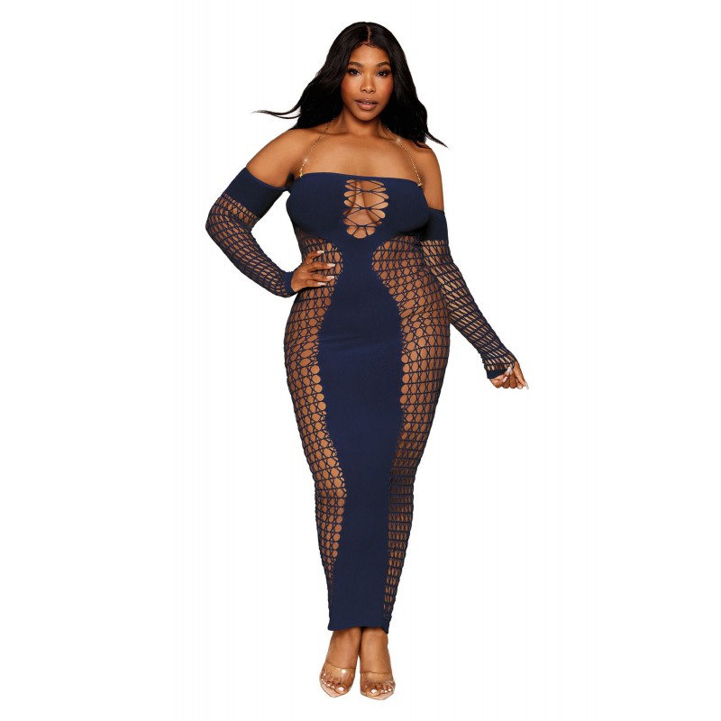 Seamless, novelty crochet knit pattern bodystocking gown. Elastic strapless neckline with cutout bodice detail and gold metal flower accents. Tassel hem detail. G-String Not Included. • Material: 93% nylon, 7% spandex • Queen size fits most 180-
