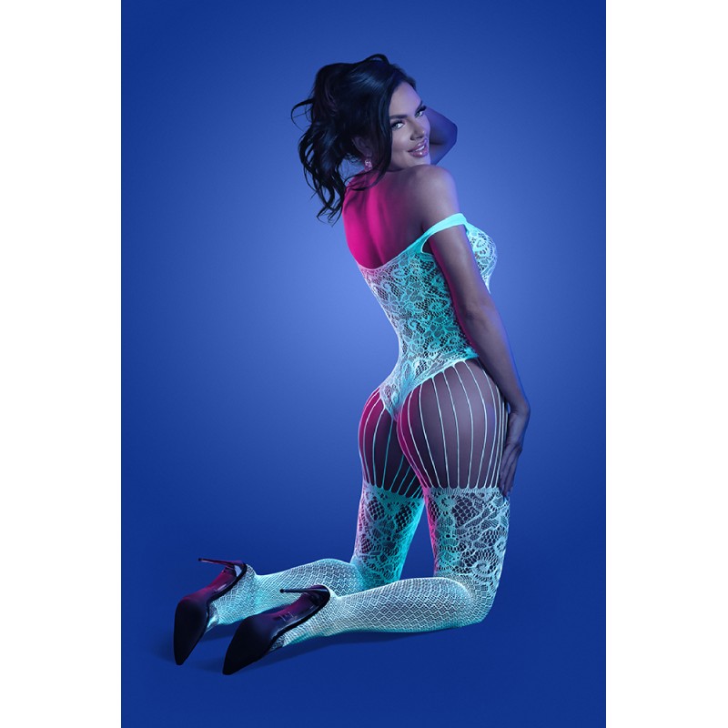 Moonbeam Crotchless Bodystocking • Stretch fishnet fabric • Lace pattern detail • Open crotch • Material: 90% nylon, 10% spandex • One Size fits US dress sizes 2-12 • Boxed item