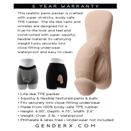• Life-like silicone packer • Squishy and flexible textured penis and balls • Fits securely into close-fitting underwear • Made from 100% body-safe silicone • Waterproof • Phthalate and latex free • Underwear not included