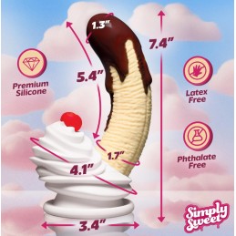 • Playful Dessert-Inspired Design: A whimsical chocolate-dipped banana split look. • Premium Silicone Construction: Smooth and body-safe silicone that blends novelty styling with premium functionality. • Realistic Size & Shape: Measures 7 3/8 inches in total length with a gently curved shaft. • Strong Suction Base: Secure suction base for hands-free movement. • Firm Yet Flexible Feel: Offers satisfying firmness by maintaining enough flexibility for comfort. • Free Phthalate & Latex: Made from non-porous and easy-to-clean materials.