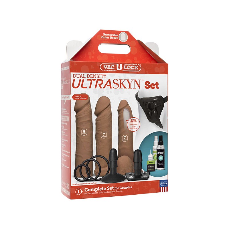 Black leather harness with a red Vac U Lock plug can be used by either sex. Includes a 8 inch ultra realistic cock and a powder lube dispenser.