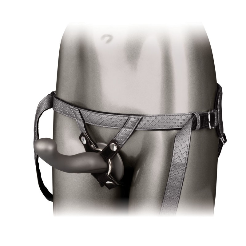 Both partners can experience the pleasure of penetration with this innovative strap on harness set. Perfect for two women or pegging, the smaller dildo slips easily and comfortably into the wearer while a small nub stimulates her clit. The larger d