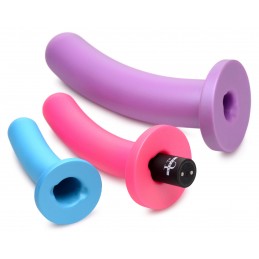 Play with different sizes with this Triple Peg dildo set! The multi-colored dildos come in small, medium and large and each size has its own color so you can tell them apart at a glance! The blue, pink and purple dildos are silky smooth, premium silicone that is phthalate-free and body safe for worry free fun! The vibrating bullet can be inserted into any of the dildos at the base and is fully rechargeable via the magnetic USB charging cable included. Enjoy 4 speeds and 7 patterns of powerful vibration! To make things easy, a remote control is paired with the vibrator so you can adjust settings without ever having to take out or re-insert the vibrator.