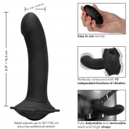• Fully adjustable waist and thigh straps stretch to fit up to 52" (132 cm) • Pliable shaft with curved tip for g-spot action • Perfectly contoured base with added pleasure ticklers • Powerful independent dual motors in the shaft and base for mutual stimulation • 10 independent functions of rumbling vibration, pulsation and escalation • Memory chip resumes on last function used • Security travel lock feature - hold both buttons on the probe for 3 seconds to turn on or off • Probe may be used independently of remote • Body safe, unscented, phthalate free • Waterproof probe may be used in or out of the water • USB rechargeable • Instructions included