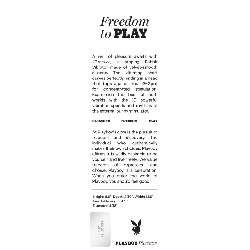 A well of pleasure awaits with Thumper, a tapping Rabbit Vibrator made of velvet-smooth silicone. The vibrating shaft curves perfectly, ending in a head that taps against your G-Spot for concentrated stimulation. Experience the best of both worlds with the 10 powerful vibration speeds and rhythms of the external bunny stimulator.
