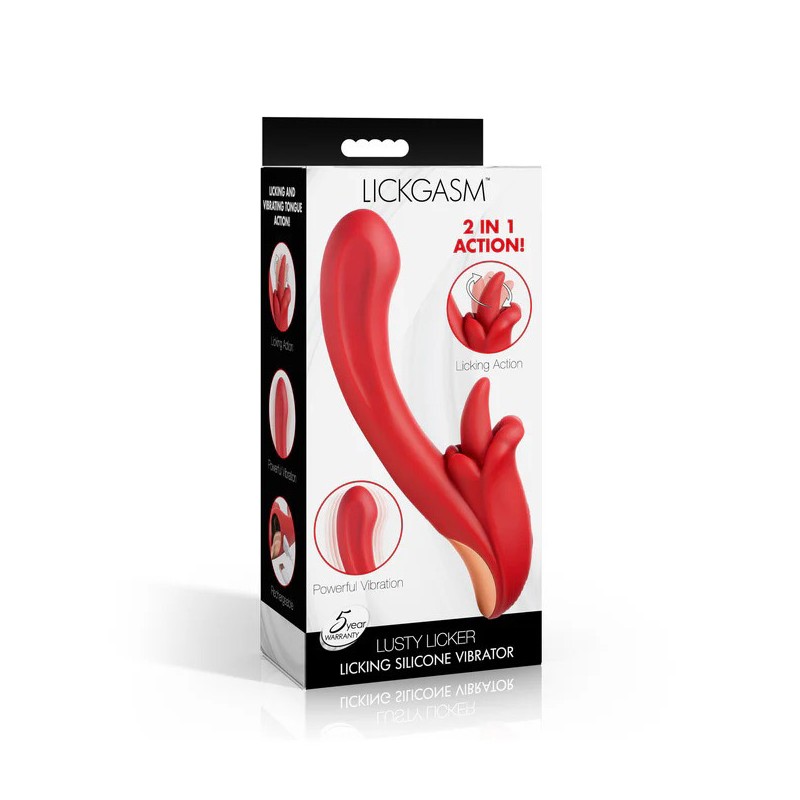 • Dual Stimulation: This Lusty Licker gives you two-in-one action with a licking and vibrating tongue on your clit and a vibrating shaft inside you! Enjoy the long tongue protruding from puckered lips and the curved, G-spot-hitting shaft. • Variety of Settings: Enjoy 3 speeds and 7 patterns of vibration and 3 speeds and 7 patterns of licking! • Premium Silicone: Trust in high-quality, premium silicone. It's body-safe and silky smooth. • Waterproof and Rechargeable: Rated IPX7 waterproof, you can take this toy in the shower or tub. Recharge between uses via the USB cable provided.