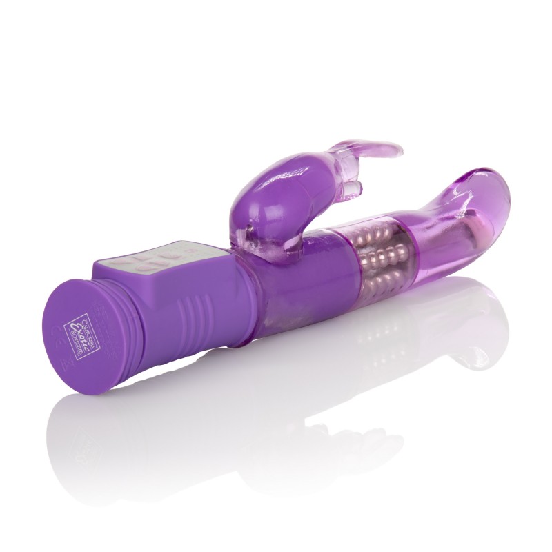 Petite Jack Rabbit with incredible power. 7 intense functions of vibration, pulsation, and escalation. 3 speeds of independent reversible rotation. 5 solid rows of synchronously rotating beads.